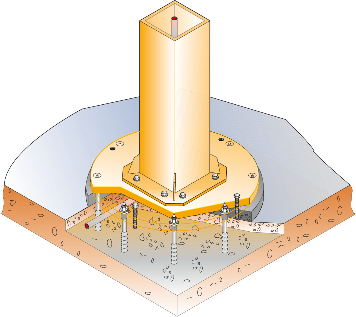 In questo caso è adatto il fissaggio con una piastra intermedia quadrangolare. La piastra di fondazione viene perforata con una carotatrice e scalpellata nella zona inferiore in modo da ottenere un buon ancoraggio posteriore dopo aver affogato (con malta) i bulloni di ancoraggio inseriti.