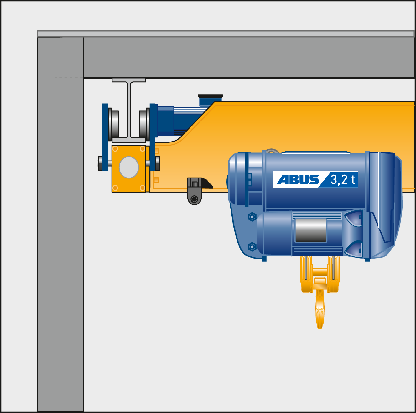 Le gru a carroponte a vie di corsa superiori ABUS sfruttano in modo ottimale la larghezza del capannone disponibile grazie ai limiti di accostamento carrello ridotti e alla regolazione individuale delle sporgenze. Inserendo la trave principale tra le travi del carrello di traslazione è inoltre possibile correggere la posizione più alta del gancio.