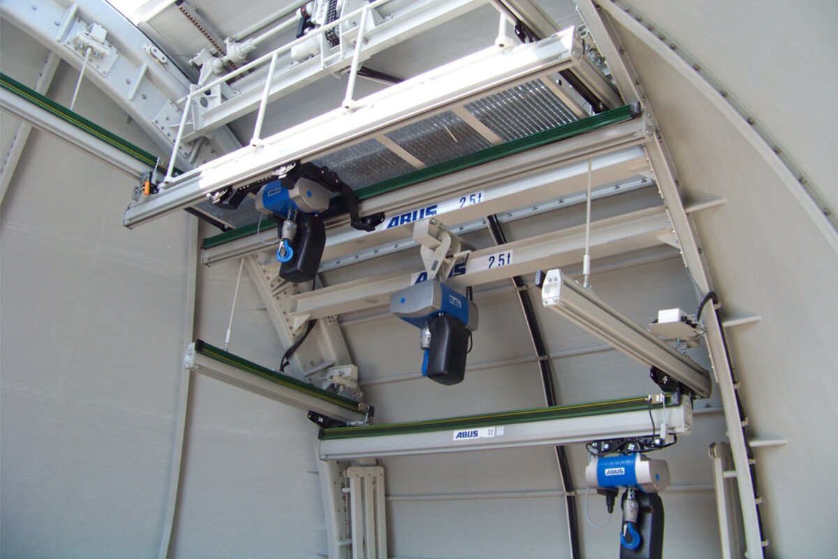 In order to master the unusual transport task within an observatory ABUS Kransysteme supplied a ZHB type crane from the product range of HB systems with a load capacity of 1,000 kg and equipped with an ABUS electric chain hoist of the GM4 type. This was rounded up by a walkable platform installed by Baader. ABUS also supplied an EHB system with a load capacity of 1,000 kg and a GM4 chain hoist as well. A fixed locally used chain hoist type GM6 completed this order. Baader designed, and added to, the central control of the crane system. The cranes and hoists are used to change and to install instruments in the telescope depending on the required application. The fixed ABUS electric chain hoist with a load capacity of 2.5 tonnes is used to mount, to dismantle, and to reinstall the main optical element of the telescope: a mirror that weighs 2 tons and has a diameter of 2 meters. This mirror requires regular recoating which means it has to be dismantled and to be reinstalled every five years. As these elements of the telescope are very valuable and almost irreplaceable an absolutely reliable transport system is de rigueur.