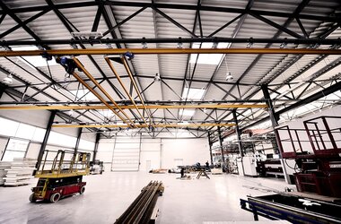 Nine HB systems in total are busy in the area where the glass is cut. The HB systems have safe working loads ranging between 500 and 630 kg and crane spans between 5.70 and 13 metres. The cutting table for glass is served by an HB system with electric crane travelling whereas cranes with manual travelling are used for the machines for milling, grinding, and for edge processing. The single girder cranes of the EHB type are characterised by low deadweight and are thus particularly suitable to be moved by hand. A double girder crane of the ZHB type is the solution for higher load capacities. The ZHB system allows not only for higher SWL but also for larger crane spans, 13 metres in this case. Some of the HB systems have vacuum devices typical for the glass industry to make lifting the glass plates extra safe. Not only have the requirements of the customers as to transport within the production grown over the years but so have the HB systems. The different systems have been installed between 2011 and 2015 and are proof of the special characteristics of the HB system: great flexibility and tailored solutions for extensions, adaptations, and modifications.
