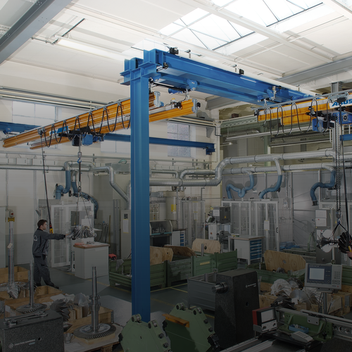 This solution saw a total of six single girder EOT cranes supplied: two of these bridge cranes are equipped with electric wire rope hoists with safe working loads of 3,200 kg each and work in tandem (this means that one user is operating two EOT cranes simultaneously). Two more cranes may also be operated in tandem but they have higher load capacities: both wire rope hoists can lift loads of up to 6,300 kg. In the upper transport level where the larger loads are moved there are another two single girder EOT cranes also with SWLs of 3,200 kg each. However, these last two cranes are only working individually, i.e. they do not work in tandem. The internal material logistics was completed by the installation of twenty HB systems for load capacities between 250 kg and 2,000 kg. The modular lightweight rail system is used in the production of São José to transport, and to install, smaller parts and components. Thus a complete production line was established in the manufacturing process. One pillar jib crane with a SWL of 250 kg serves one individual installation workstation. The aim and the request of the customer to create a dynamic manufacturing process could be achieved thanks to the combination of several ABUS crane types in dependence of the load capacity required and the site of operation of the crane.