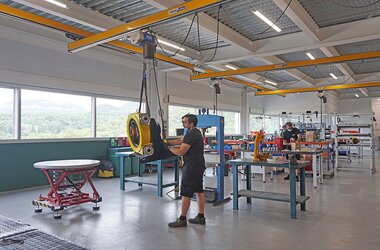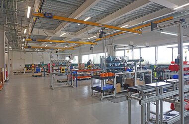 HB suspended rail systems were chosen as the solution to make work more ergonomic as well as more effective. The HB suspended rail system is based on a modular design that can be adapted to almost all space requirements and this is due, among other things, to the different options for suspensions and mountings of the cranes. A total of 3 EHB cranes have been installed in the assembly area: one for each workstation. The HB systems are mounted directly onto the rolled section girders of the building.